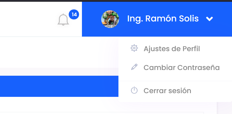 El perfil de usuario se invoca seleccionando el nombre del usuario en el extremo derecho superior, donde aparece una lista desplegable. . En ella aparece la opción de Ajustes de Perfil.
