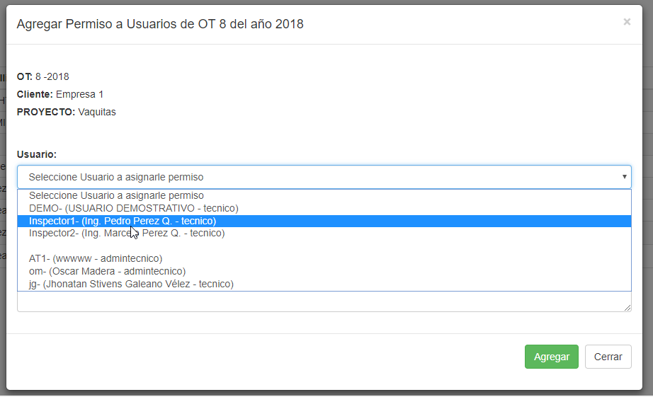 Esta opción mostrará aquellos usuarios que poseen permisos en dicha OT.
