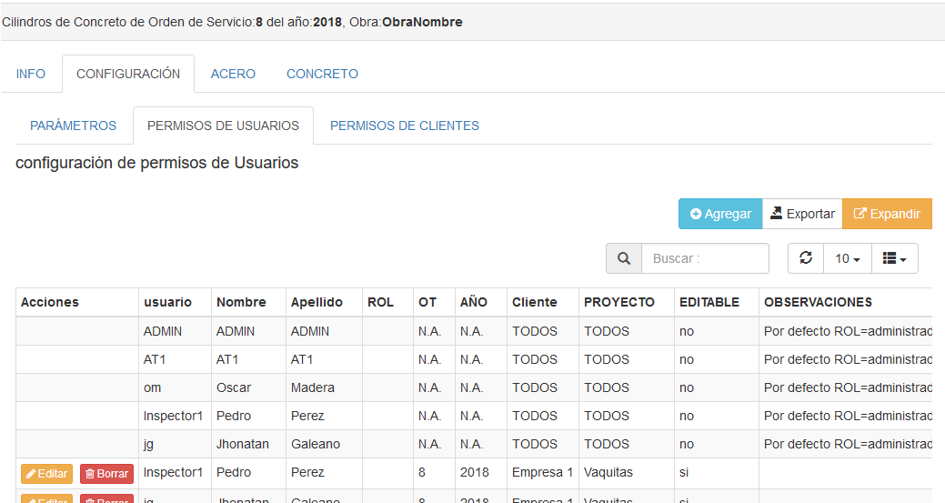Aquellos usuarios que se han agregado, se pueden borrar, por tal razón para este tipo de usuarios está activada la opción "Borrar"