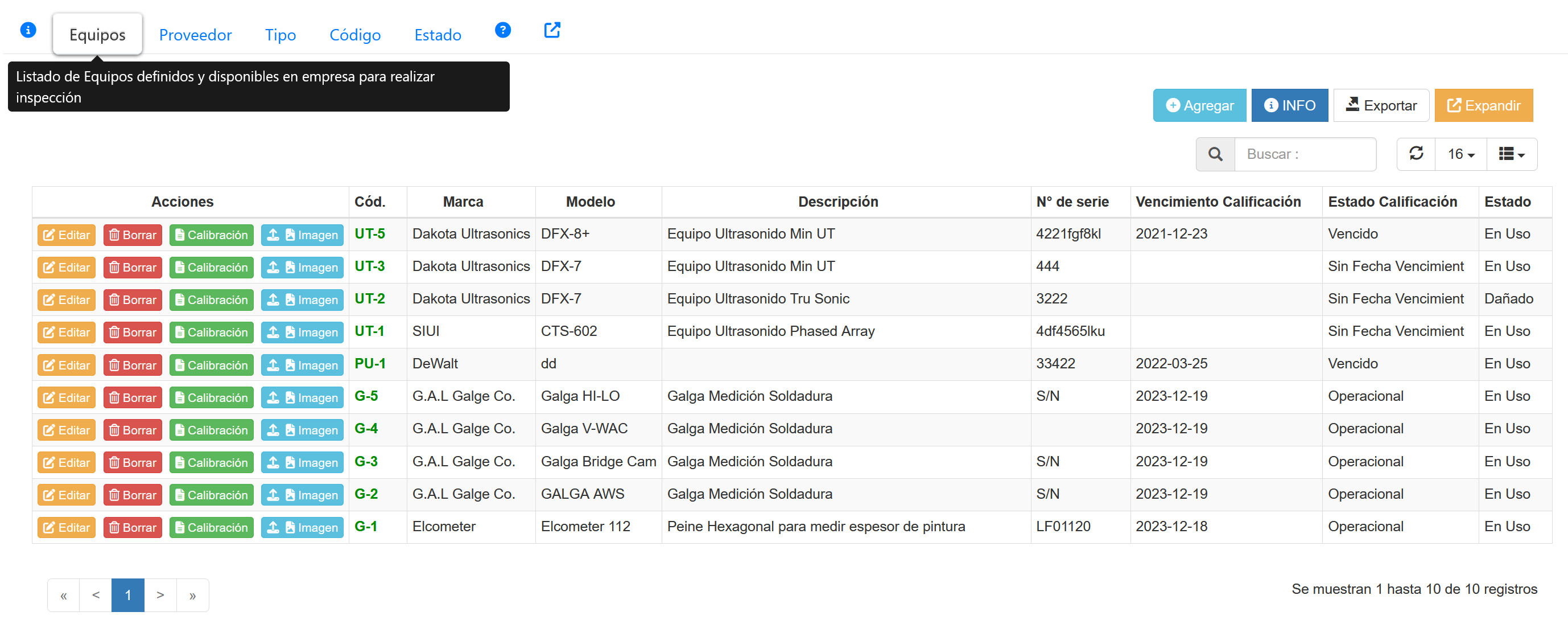 Fig 535 Extracto de pantalla, con listado de equipos de Inspección definidos en el sistema.