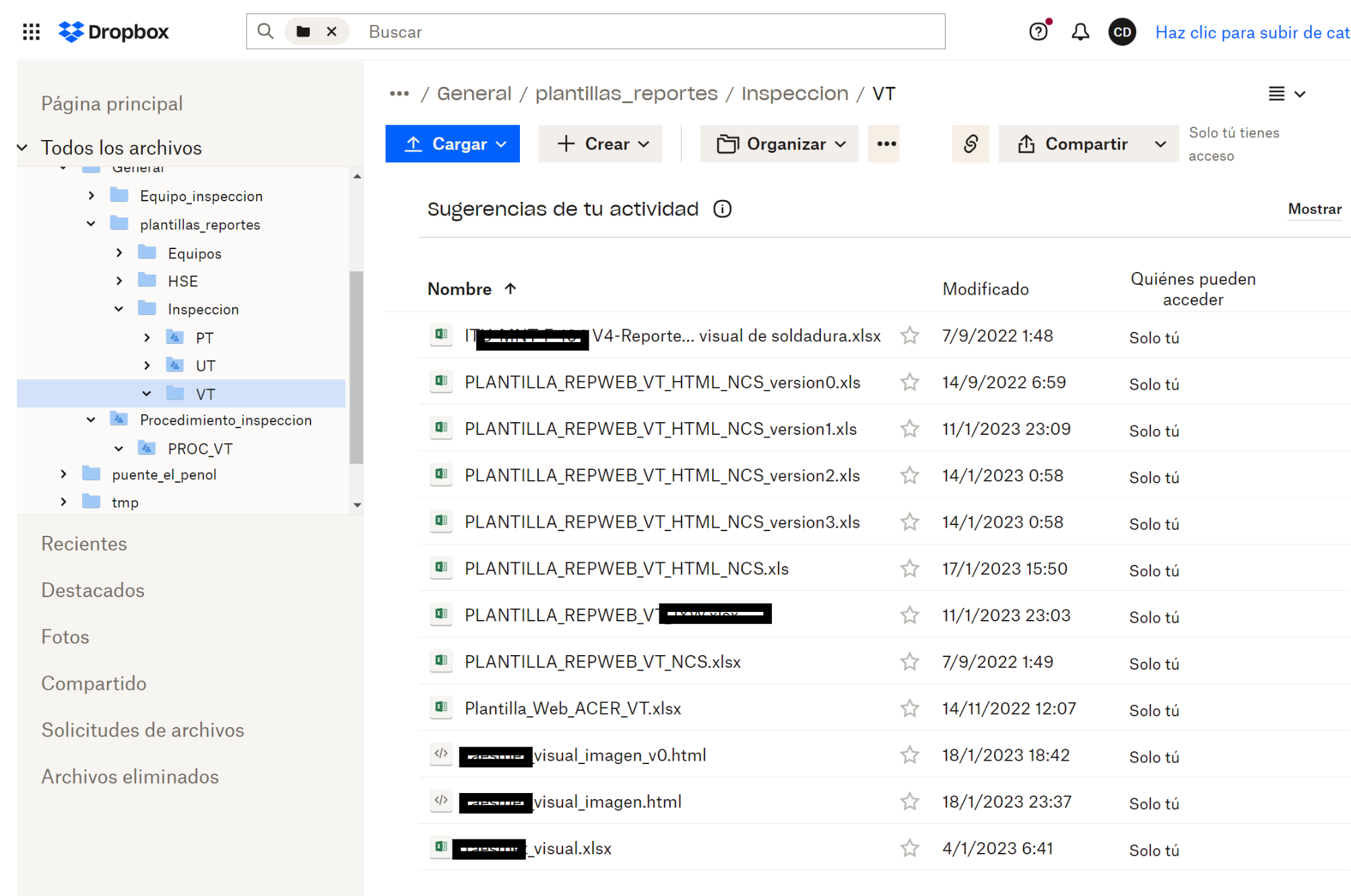 Fig 520 Extracto de pantalla, los mismos archivos anteriormente cargados vistos desde medio de almacenamiento Dropbox.