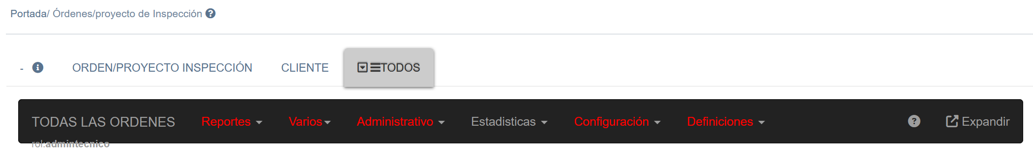 Al seleccionar la pestaña "TODOS" se presenta un menú desplegable con información general (estadísticas, reportes de alcance general, etc) válidas para toda la empresa, es decir la información entregada aquí contempla a todas las órdenes/Proyectos de inspección realizadas por la empresa, tal como se muestra en la siguiente pantalla.
