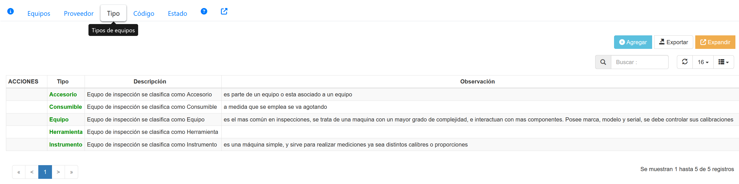 Esta opción permite definir tipos de equipos, como complemento de información para Equipos de inspección.Tal como se muestra en la siguiente imagen.