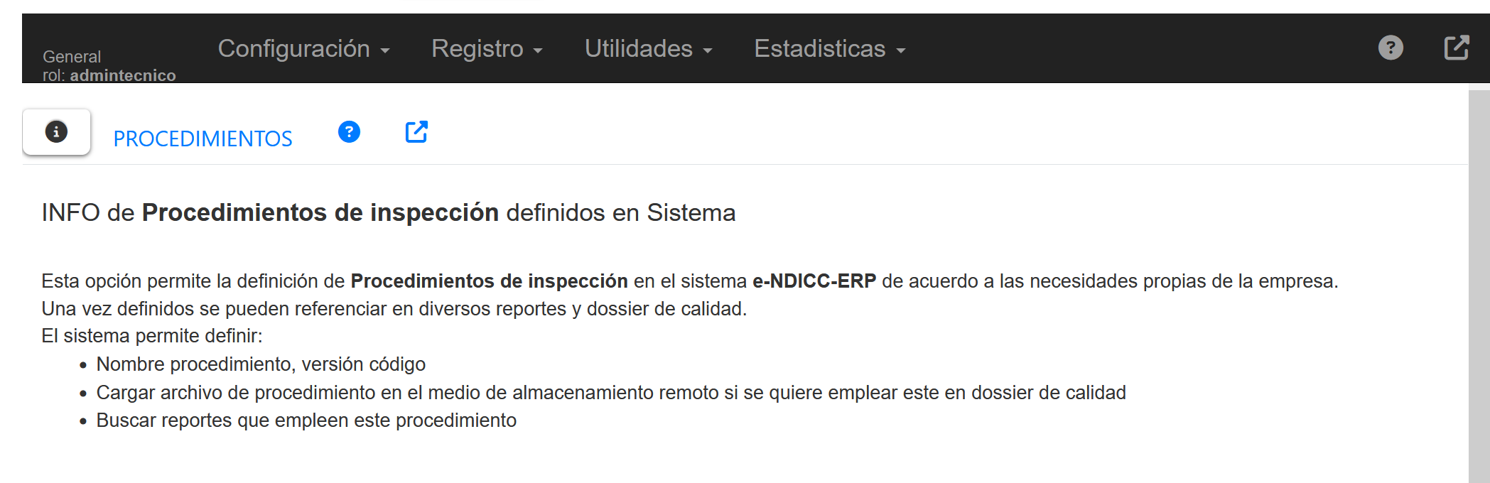 Al seleccionar la opción Configuración 🠊Procedimiento de inspección, aparecerá una pantalla con una serie de pestañas en segundo nivel tal como se muestra a continuación .