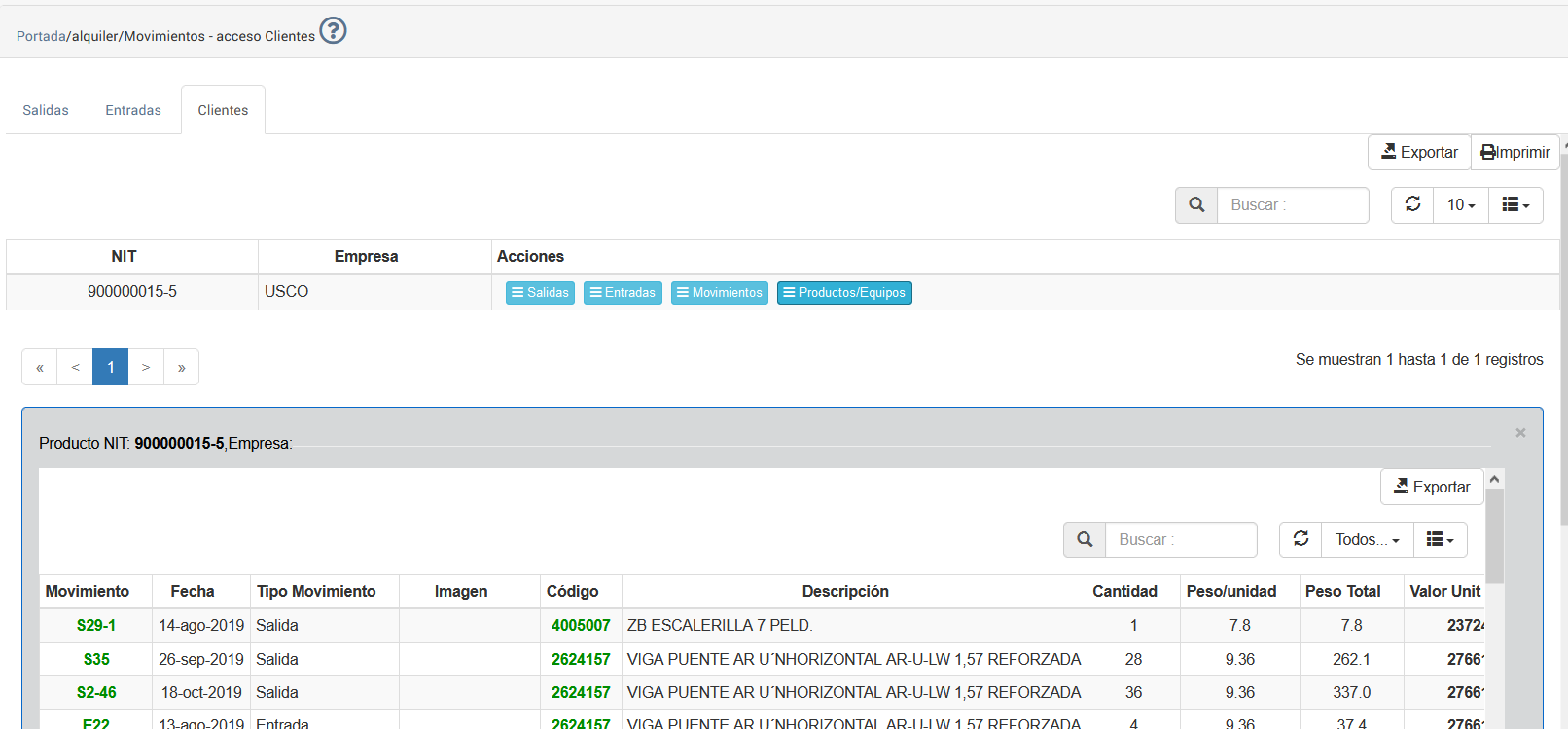 Fig 595 Extracto de Pantalla, se muestra un listado de productos de alquilados/recibidos del cliente actual