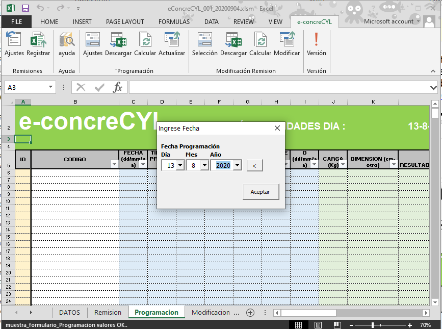 Lo más aconsejable es trabajar en el la misma plantilla EXCEL, la cual tiene un tópico relativo a programación de actividades (Programación Actividades). Para tal efecto, se selecciona la fecha de la programación y luego se presiona el botón descargar.