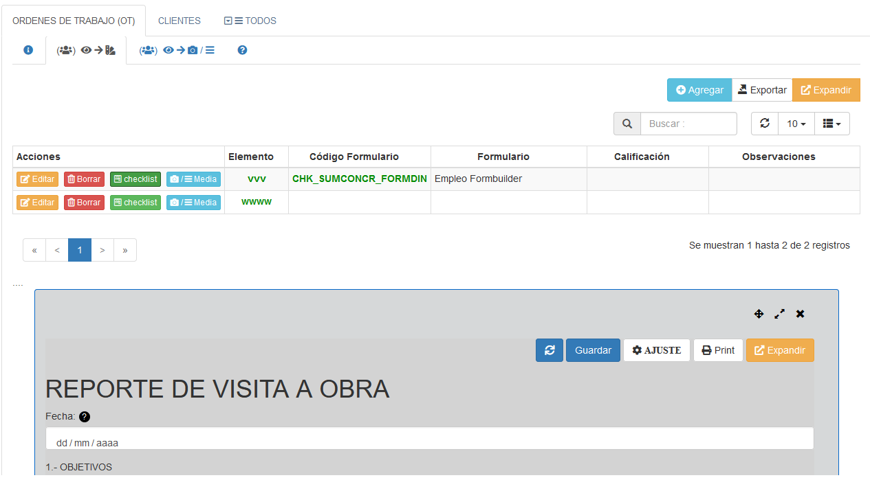 - Dinámico: se emplea un editor de formatos dinámico que genera una primera formas. Más detalles, ver Checklist Dinámicos