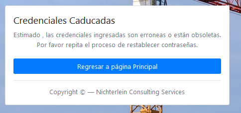 Fig 40 Pantalla credenciales caducadas si se invoca nuevamente la pantalla de restablecer contraseña.