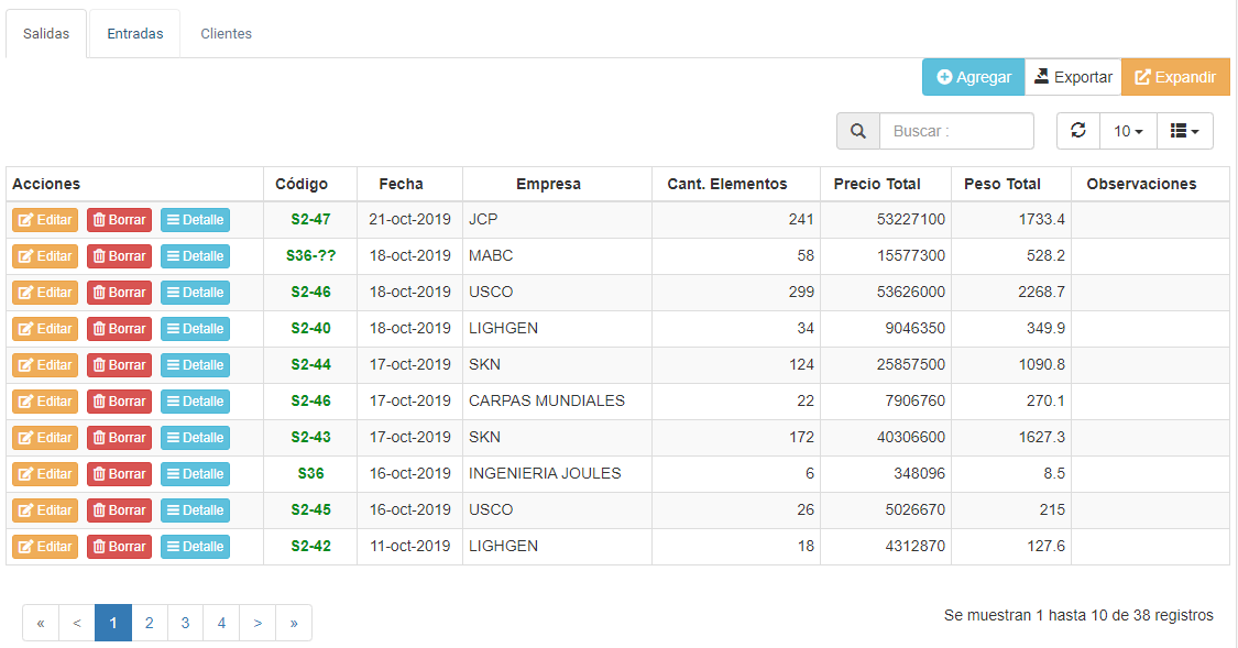 Detalle Se expande un campo de texto y se muestra un detalle del contenido de esta orden. Ver detalle de Orden de Salida