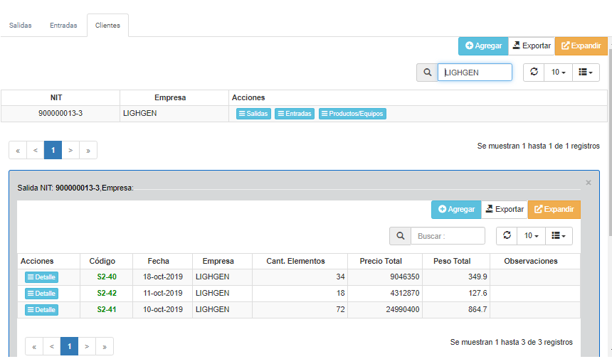 Detalle Permite visualizar el detalle de la orden de Entrada del cliente seleccionado. Más detalles ver Detalle de Orden de salida de Producto