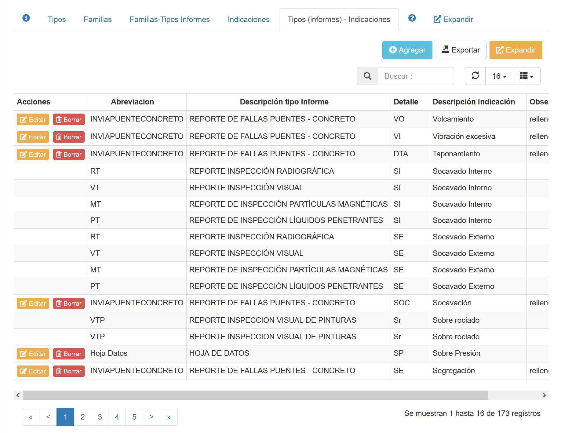 Al seleccionar la pestaña TIPOS(REPORTES) - INDICACIONES se muestra un listado de los tipos de reportes y sus indicaciones que estan definidas en el sistema, tal como se indica en la imagen siguiente.
