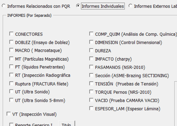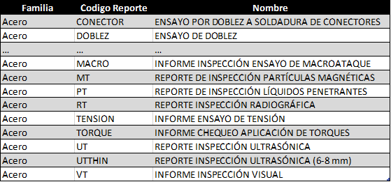 Fig 632 Listado de "algunos" tipos de reporte asociados a familia de Inspección Acero