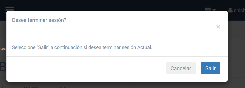 Al seleccionar esta opción, permite al usuario salir de forma adecuada del sistema ya que se destruye las variables del usuario. Antes de salir se presenta una pantalla que pide confirmación.