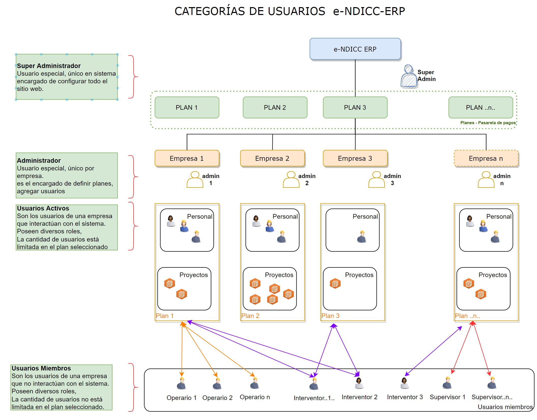 El sistema e-NDICC-ERP permite la interacción de diversas categorías de usuarios tal como se muestra en la siguiente imagen.