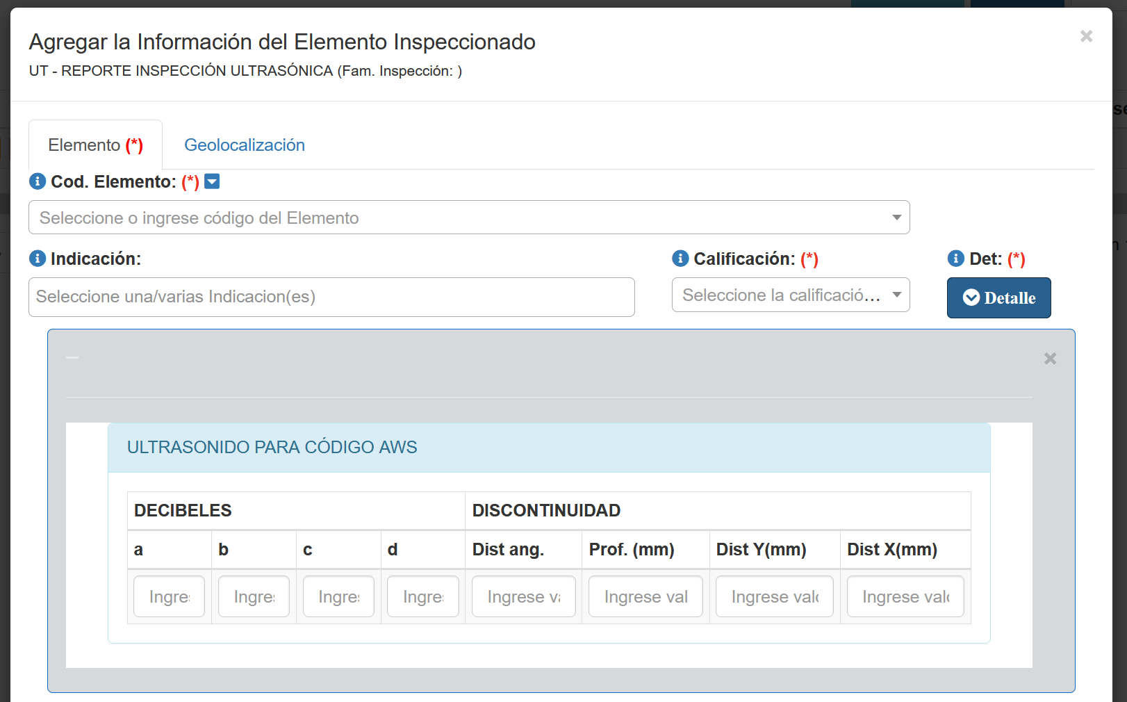 En el caso de ultrasonido, el formulario de indicaciones se puede visualizar cuando se agrega un nuevo elemento a inspeccionar y se activa la opción detalle de la indicación, tal como se aprecia en la siguiente imagen.