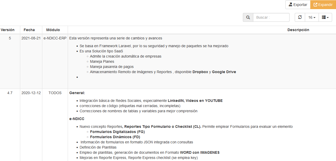 Al seleccionar esta opción se despliega un listado indicando las versiones generales que ha tenido el sistema e-NDICC-ERP, tal como se muestra en la siguiente imagen.