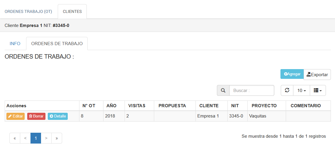 Al seleccionar una orden de un determinado cliente, se presenta un listado de las ordenes de trabajo del cliente determinado, con características similares a la desplegadas para todas las ordenes.