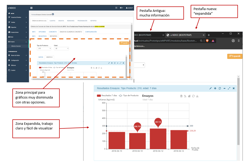 Fig 56 Extracto de Pantalla, indicando zona disminuida de gráficos y zona Expandida en otra pestaña